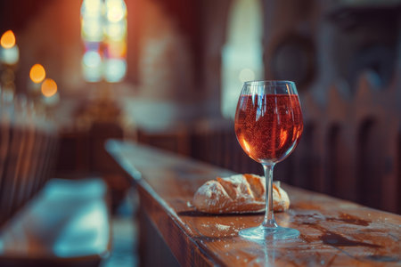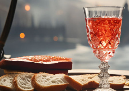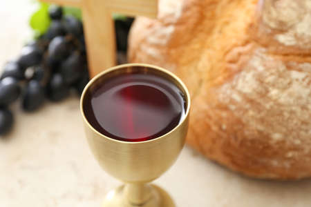 Chalice of wine with bread on table, closeup