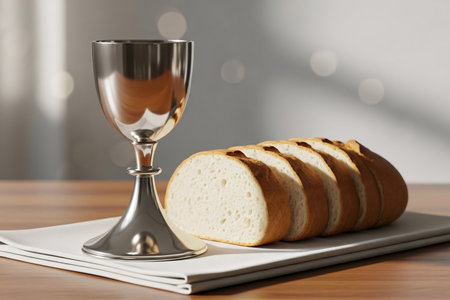 Polished chalice with wine and sliced communion bread on a white linen cloth, capturing the essence of Holy Communion during Easter in a serene setting.