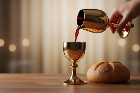 Red wine being poured into a chalice beside communion bread on a wooden table, capturing the action of the sacred Eucharist ceremony during Easter.