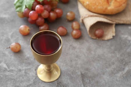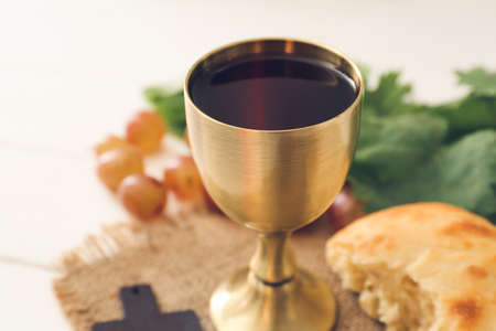 Taking holy communion on wooden table in church. Cup of red wine and bread on wooden table. Corpus Christi concept.