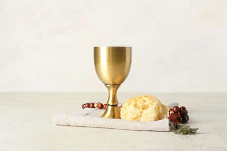 Cup of wine with bread and rosary on light background