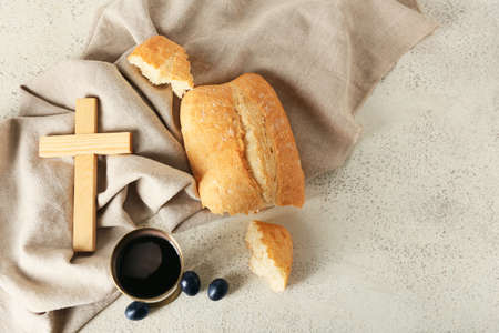 Cup of wine with bread and cross on light background