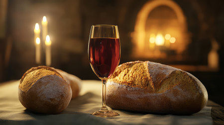 A candle and a glass of wine are on a table next to a loaf of bread. The scene is set in a church, and the bread and wine are likely to be part of a religious ceremony. The candles and wine are lit