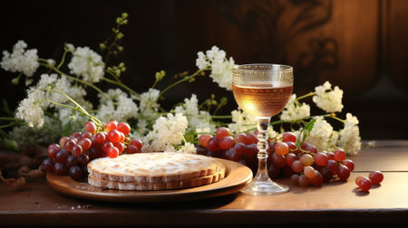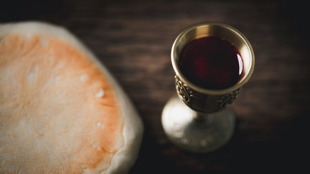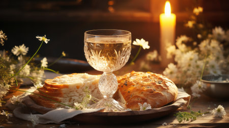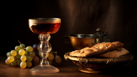 Unleavened bread chalice of wine. Communion still life. Generative AI