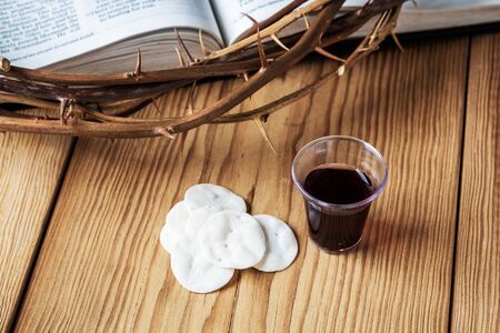 Communion bread and wine with the Holy Bible and crown of thorns, symbolizing the sacrifice of Jesus Christ, the passion, salvation and Christian faith in the Eucharist and Lord Supper.