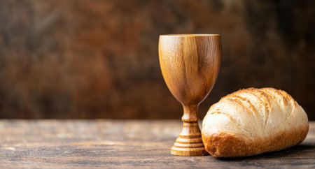 Communion cup and bread on wooden table