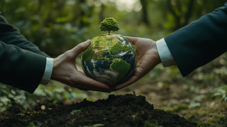 Hands of diverse people holding a globe surrounded by lush greenery, symbolizing unity in nature.