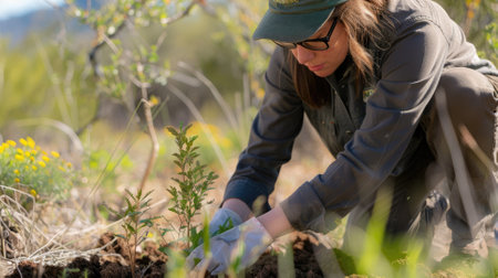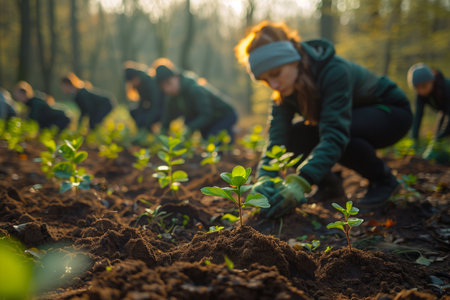 a photo of capturing a group of volunteers engaged in a conservation project, such as planting trees, cleaning up natural sites, or wildlife monitoring, highlighting the importance of active participation in environmental protection.