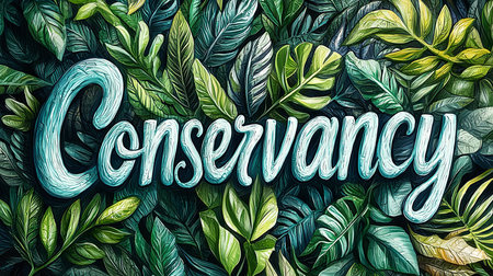 Vibrant hand-drawn lettering of 'Conservancy' amidst lush green foliage. This artistic illustration emphasizes nature, conservation, and environmental themes with its vivid and naturalistic design.