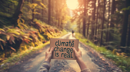 A close up view of a save the earth poster held by a climate change activist during a rally for the environment, with blurry trees in background