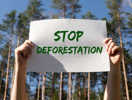 Stop deforestation inscription on paper in male hands. Save forests concept.