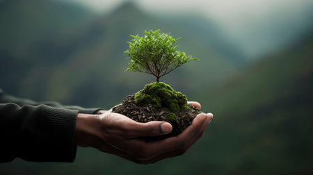 A hand cradles a small tree with a backdrop of a mountain range. The scene exhibits a naturalistic aesthetic, with muted greens and browns dominating. The composition uses a shallow depth of field, focusing on the tree. Suitable for environmental or conservation themed projects, and editorial articles.