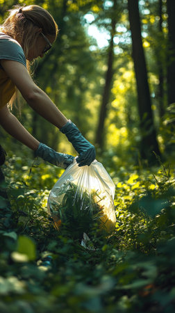 Volunteer cleaning forest from trash, wearing gloves and holding plastic bag with garbage