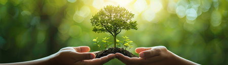 Cupped hands tenderly hold a young evergreen sapling with soil, symbolizing growth, care, and environmental responsibility.