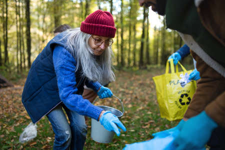 Senior woman volunteer cleaning up forest from waste, community service concept.
