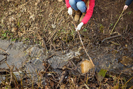 Volunteers collecting garbage in the forest. Nature pollution concept.
