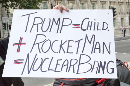 London, 28th September 2017:- Protesters gather in Whitehall, opposite Downing Street, to protest the growing tensions between North Korea and the USA
