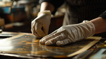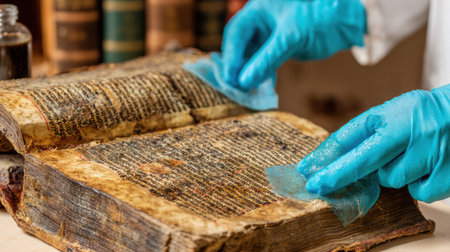 Hands in gloves carefully clean the surface of a deteriorating ancient manuscript using special tools in a conservation workshop environment.
