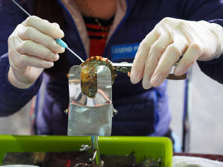 Cultured pearl farm. Surgical implantation of an irritant in an oyster shell to produce pearls.