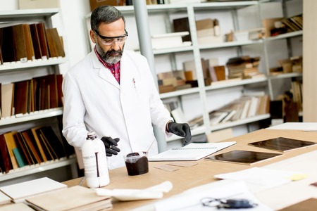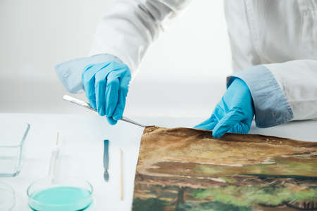 Restoring old oil painting, conservator removing varnish from an oil painting