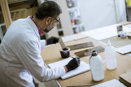 Photographer in white gloves watching photo film in his hands while sitting at table with lightbox