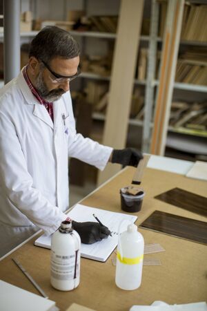 Handsome mature engineer testing colors on wooden specimens in the furniture factory