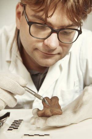 Archaeologist analyzing ancient artifacts, loom weight or fishing net weight.