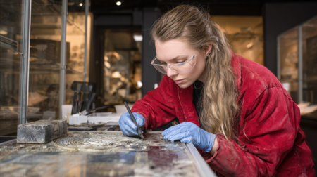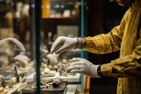 A skilled curator is carefully restoring and preserving ancient artifacts that are displayed within a museum exhibit. Generative AI