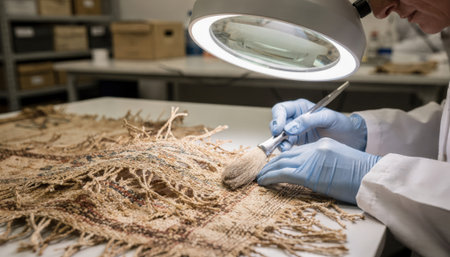 Conservator gently cleans fragile textile fragments under magnifying glass focusing on intricate fibers in a museum artifact conservation lab setting.