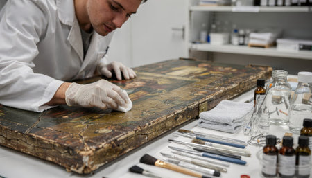 Conservator repairing a damaged mixedmedia artifact combining physical restoration with digital cataloging in a specialized lab.