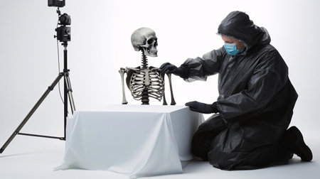 Detailed view of a cluttered workbench featuring an array of organic samples in jars and tools for dissecting with a senior biohackers silhouette in the background emphasizing an.
