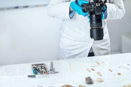 Dentist taking photo of 3d dental model on the table. Dental model with mini screw. Orthodontic dentistry. False teeth