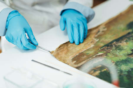 Restoring Oil Painting Canvas. Restoration expert revitalizing crumpled canvas on a damaged oil painting