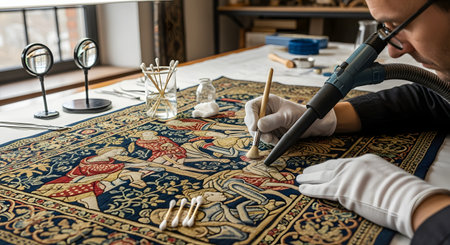 A conservator wearing white gloves carefully restores a fragile, ancient tapestry using specialized tools like a brush and a low-pressure vacuum. The meticulous work is done in a well-lit studio, focused on preserving historical art and textiles.