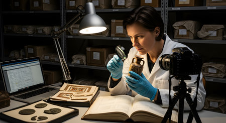 A focused female archaeologist using a magnifying glass to examine an ancient pottery vase in a research laboratory. The room is filled with archival boxes, books, and artifacts, highlighting the scientific study of history.