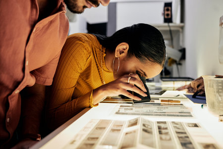 Photography, editing and film negatives for looking, magnifying glass or zoom analysis at photo journalist job. Photographer man, analyse or focus with woman in studio for creative choice in teamwork