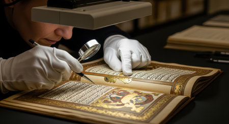Female adult examining ancient manuscript with magnifying glass under lamp