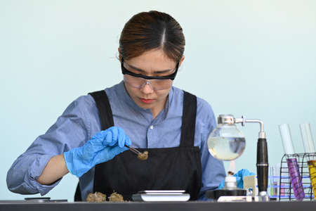 Scientist with glasses and gloves making herbal medicine from cannabis in the laboratory. Herbal alternative medicine, cbd oil concept.