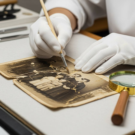 A person carefully restores a vintage photograph in a crafted workshop, surrounded by tools and art supplies.