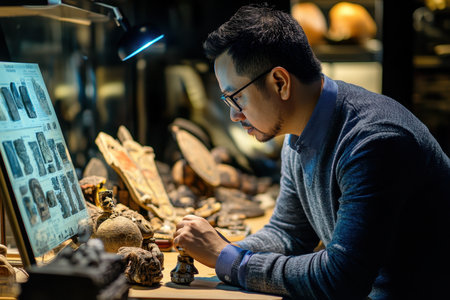 Man studies historical artifacts on a desk in a museum, illuminated by a soft light in a calm environment.