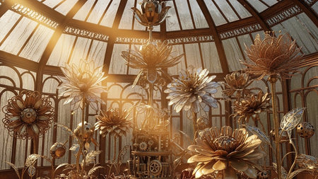 A steampunk greenhouse filled with ornate mechanical flowers bathed in warm sunlight.
