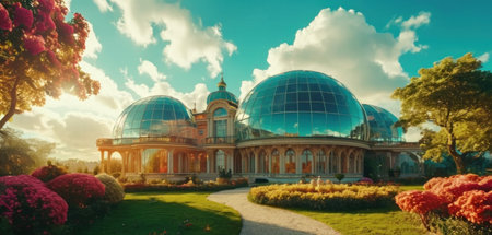 Glass dome in the garden with beautiful flower garden at sunset time.