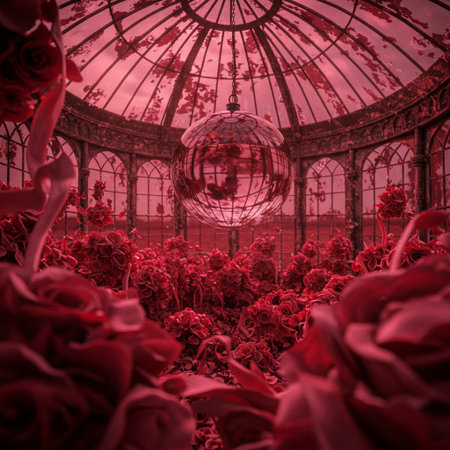 Red roses in a greenhouse with a mirror ball. 3d rendering