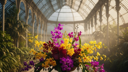Colorful orchids fill the Victorian glass dome conservatory, illuminated by soft sunlight streaming through the glass.