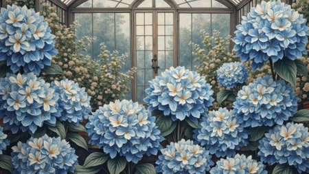 Blooming blue hydrangeas in tranquil sunlit conservatory with elegant glass windows. That the image is generated using AI.