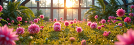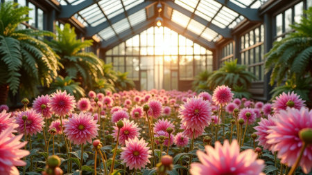 Sunlit dahlia greenhouse with vibrant blossoms and lush greenery at sunset. That the image is generated using AI.