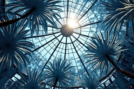 Sunlight through glass dome and palm trees in winter. That the image is generated using AI.