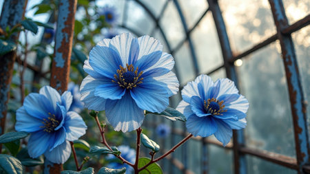 Stunning blue flowers blooming in vintage greenhouse with sunlit background. That the image is generated using AI.