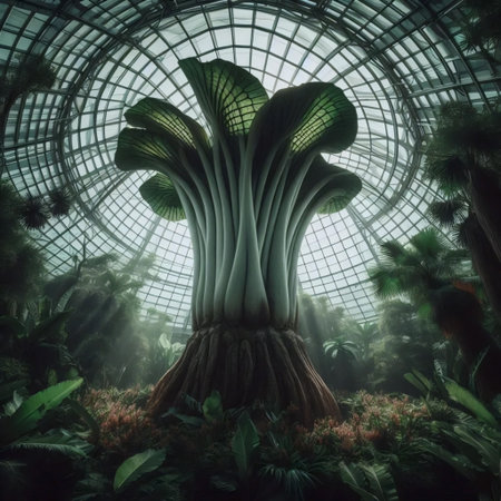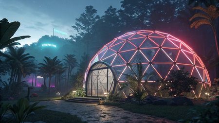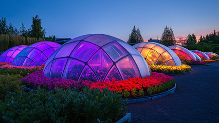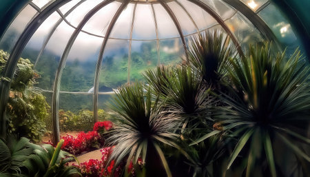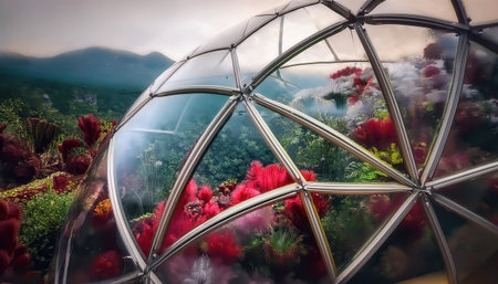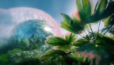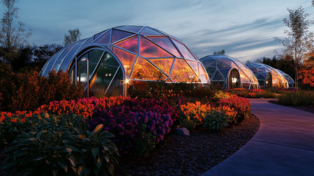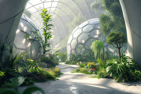 Experience the tranquility of a futuristic geodesic dome greenhouse oasis with lush vegetation and modern architecture