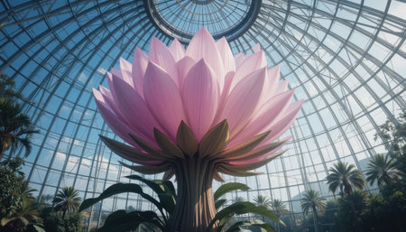 Beautiful pink lotus blossoms inside a glass structure surrounded by lush greenery and bright sunlight.